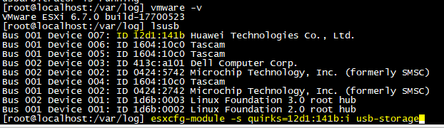 esx-cfg-module -s quirks=12d1:141b:i usb-storage (In your case ID should be definitely different so be aware of that)