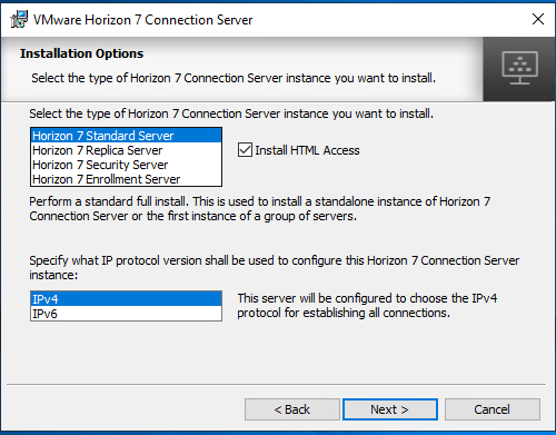 Select the Horizon 7 Standard Server as we install connection server and enable the HTML access as well. Default IPV4 is selected or IPV6 can use as per the environment.
