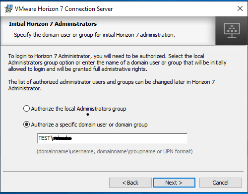 Here put usernames or specific groups which authorize to horizon administrator. This will automatically come with current logged user, and you may add more users or groups. It is possible to add the users later via Horizon administrator GUI as well.