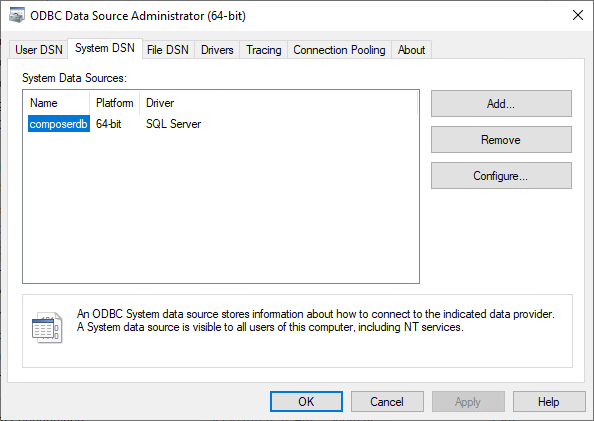 As per the above screenshot name of the DSN is “composerdb” In your case this name can be different but make sure to put the same name in the DSN name in the composer installation wizard. Please see the below pictures it will make you this clear.